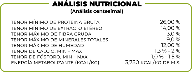 Harina de carne y huesos bovinos, harina de subproductos de pollo, aceite de pollo, hidrolizado proteico de vísceras de pollo, maíz, harina de soja, afrechillo de trigo, leucina, arginina, cloruro de colina, zeolita, metionina/cistina, lisina, valina, isoleucina, treonina, histidina, Vitaminas (A, D, E, K, B1, B2, B6, B12), Cloruro de sodio, metionina, carbonato de calcio, triptófano, MOPS, esmectita de sodio, Betaglicanos, FOS, sulfato de zinc, sulfato ferroso, pulpa de remolacha, aceite de romero, ácido nicotínico, propionato de calcio, colorantes (pardo/marrón y rojo punzó), ácido pantoténico, sulfato de cobre, cloruro de potasio, sulfato de manganeso, cobalto, iodato de calcio, ácido fólico, biotina, selenito de sodio.